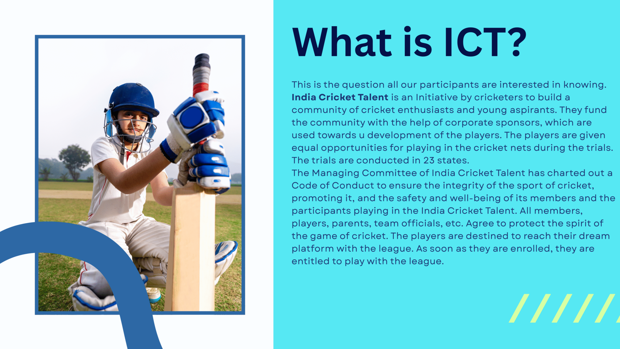 India Cricket Talent (ICT) isn’t just a cricket tournament; it’s a launching pad for aspiring cricketers. If you dream of a future in cricket, India Cricket Talent provides unparalleled opportunities to showcase your talent and rise through the ranks. With cricket trials, state-level leagues, national auctions, international tours, and a chance to get noticed by top team owners and celebrities, ICT offers the ultimate cricketing experience. Elevate your cricketing career with India Cricket Talent, where dreams take flight, and the journey to cricketing glory begins. Join us and be a part of the cricketing revolution!